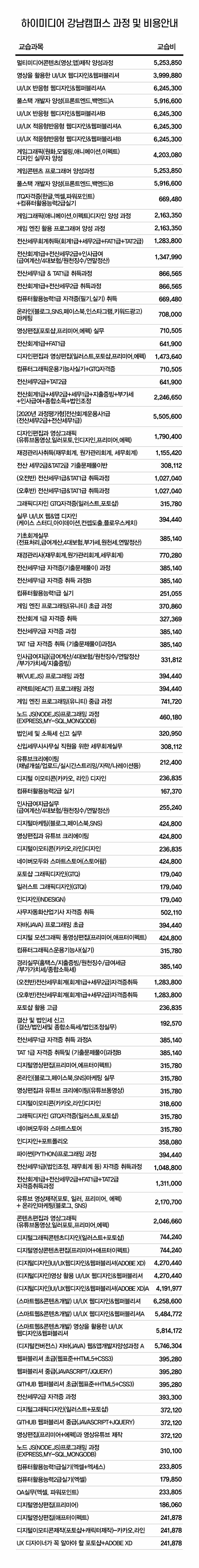 2020 강남캠퍼스 교습비게시표