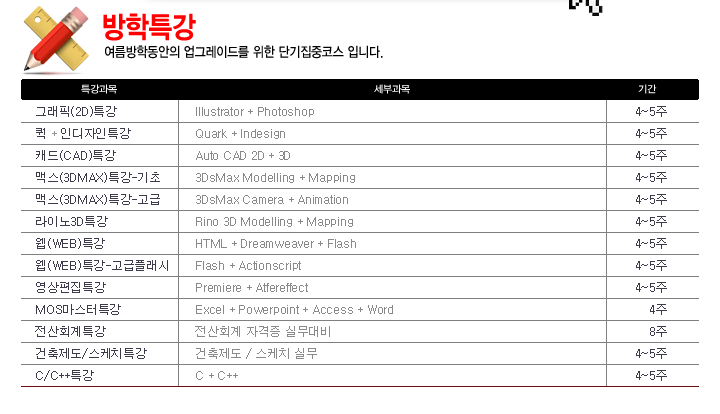[이벤트]여름방학특강 사전접수 할인 이벤트 2013.05.29 여름방학특강 사전접수이벤트 이벤트 기간내에 사전접수 하시면 7만원 할인쿠폰(최대50%할인)를 SMS문자로 받으 실 수 있습니다.