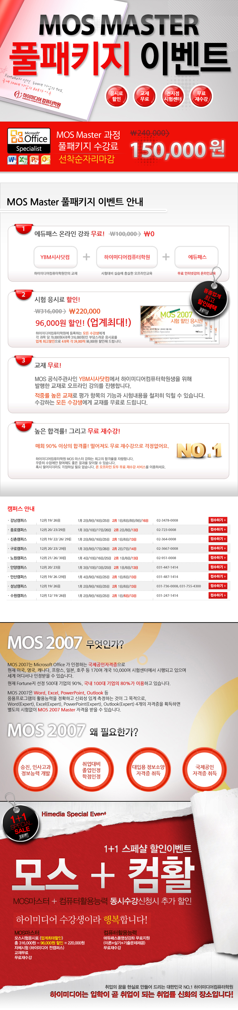 [종료] MOS마스터 풀패키지 이벤트 2011.12.01 MOS마스터 풀패키지 이벤트 1) 수강료 대박할인 2) 응시료 할인 (업계최고할인) 3) 온라인동영상강좌 무료지원 4) 불합격시 무료 재수강
